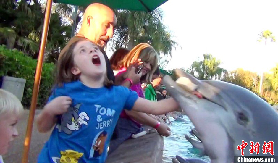 当地时间2012年12月,美国佛州,Jamie Thomas带着8岁的女儿Jillian到动物园喂海豚,却被这只突然从水面跃起的海豚紧紧咬住装满鱼儿的硬纸盒,并且还咬到了Jillian的手。图片来源:东方IC 版权作品 请勿转载