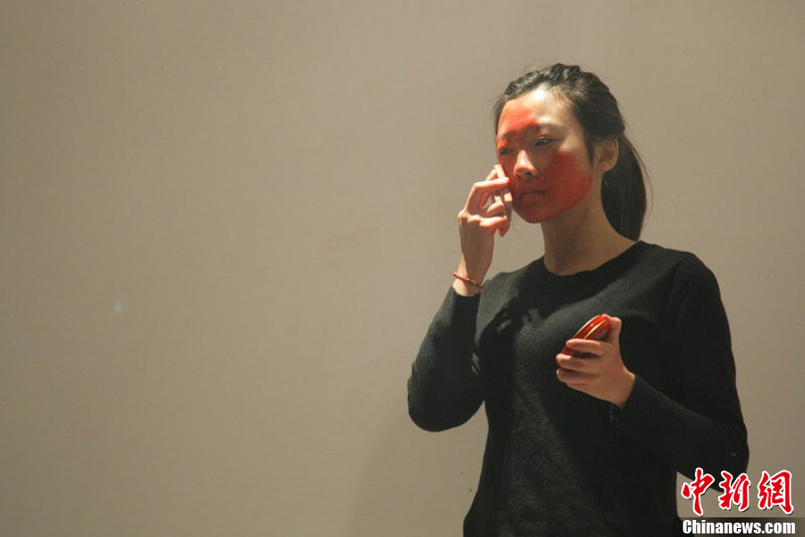 2012年12月19日,四川美术学院进进行了一场特殊的考试———行为艺术表演。图为周晓夏《生效》,周晓夏用图章盖满自已的面部。图片来源:东方IC 版权作品 请勿转载