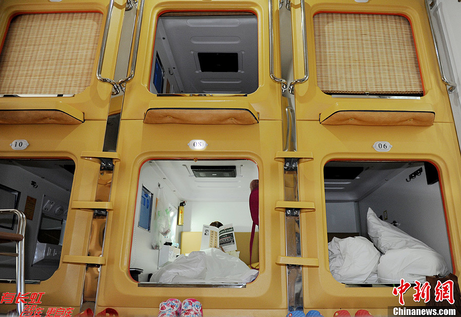 12月20日,在西安一家“太空舱”宾馆的前台,一块“最后晚餐”的牌子显得格外醒目。该店老板笑言,在传说中的21日“世界末日”来临前,许多青年前来入住“太空舱”,生意比较火爆,而为大家准备的“最后晚餐”则是锅贴。图为进入“太空舱”需换鞋。张远 摄