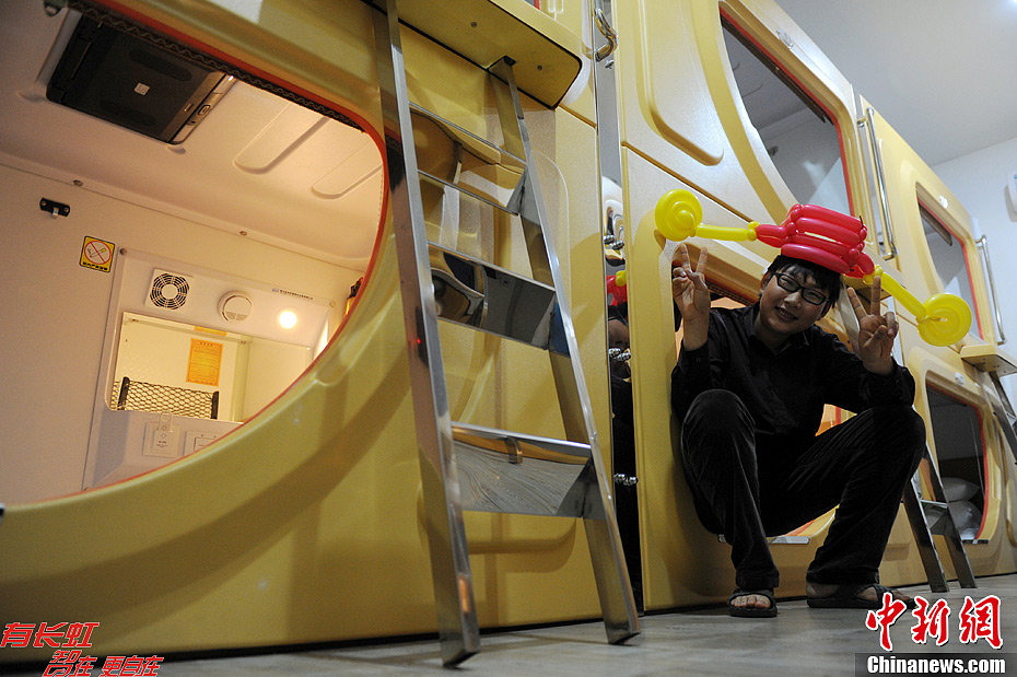 12月20日,在西安一家“太空舱”宾馆的前台,一块“最后晚餐”的牌子显得格外醒目。该店老板笑言,在传说中的21日“世界末日”来临前,许多青年前来入住“太空舱”,生意比较火爆,而为大家准备的“最后晚餐”则是锅贴。图为做气球生意的青年。张远 摄