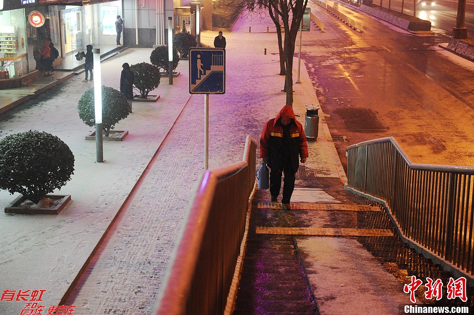 12月20日晚,随着一股超强冷空气抵达,京城迎来入冬以来最强的一次降雪降温天气。北京市气象台20日发布寒潮蓝色预警信号,预计受强冷空气影响,周末气温持续下降,22日夜间最低气温或将降至零下15℃左右,有望刷新10年记录。当日18时5分,北京市气象台发布道路结冰黄色预警信号:北京大部地区已出现降雪,由于气温较低,容易出现道路结冰,请注意防范。中新网记者 张龙云 摄