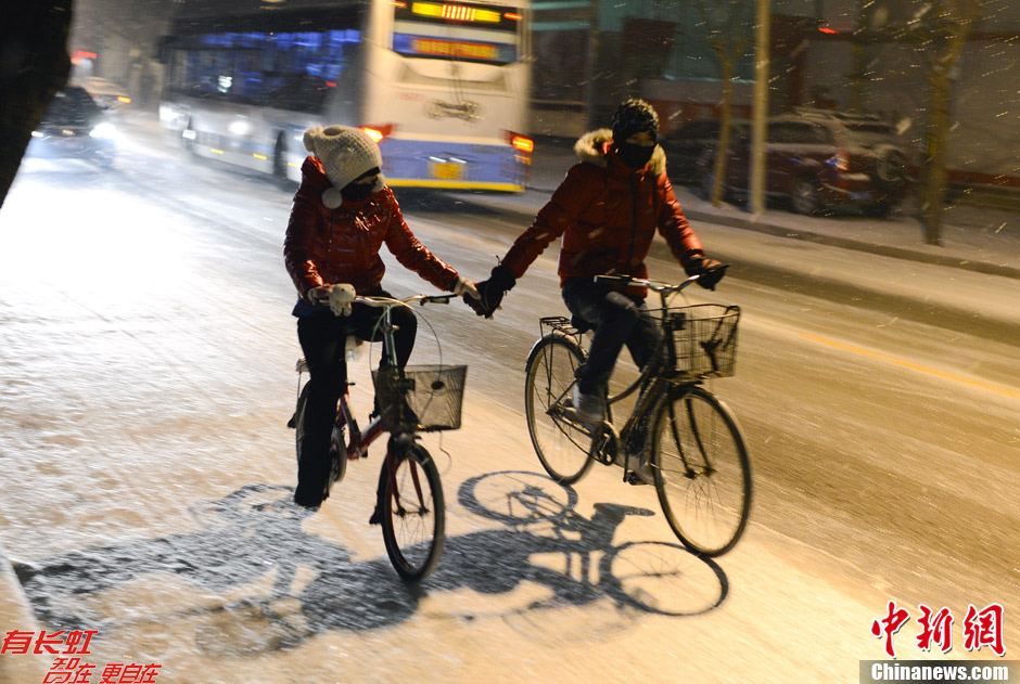 北京夜晚降温降雪 情侣手牵手雪中骑行