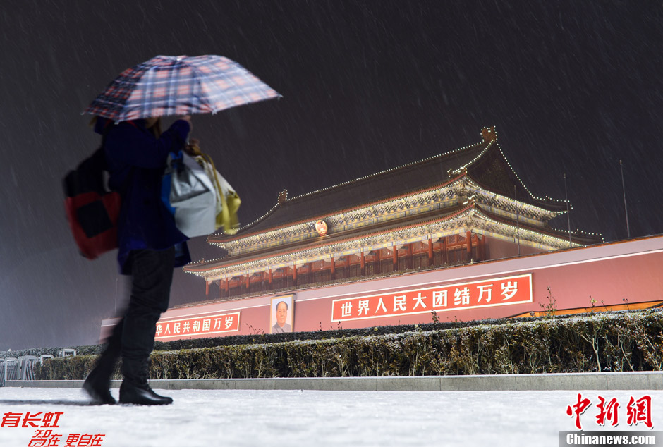 北京夜晚降雪降温 游客天安门前驻足观雪景