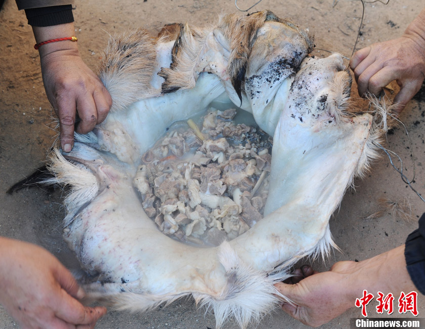 12月21日是中国二十四节气中的冬至日,有“中国彝族第一村”之称的四川攀枝花市仁和区迤沙拉村内,彝家人身穿漂亮的民族服饰,围坐一起,弹唱起有上千年历史的“谈经古乐”,吃羊肉,欢歌笑语,迎接寒冷的冬天来临。图为羊皮当锅清炖的羊肉。刘忠俊 摄