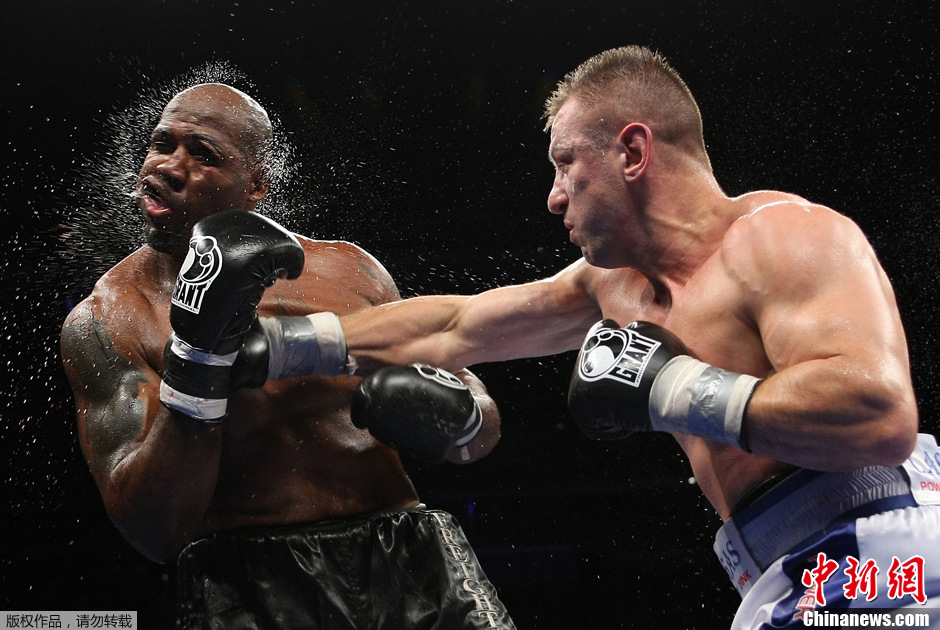 当地时间2012年9月8日,美国新泽西州纽瓦克,两名拳击选手在重量级拳击比赛中。