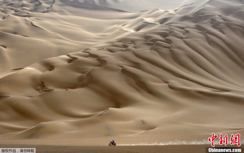 2012年1月12日,达喀尔拉力赛第11赛段,智利阿里卡-秘鲁阿雷基帕,一名孤独的摩托车手驾车行驶在沙漠之中。