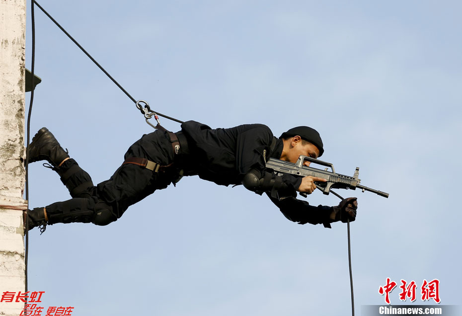 12月23日,南海舰队陆战队某旅在广东湛江某基地举行海军陆战队战术连贯演练。图为曾赴亚丁湾索马里海域执行护航任务的护航特战队进行攀登滑降战术演练。中新社发 杜洋 摄