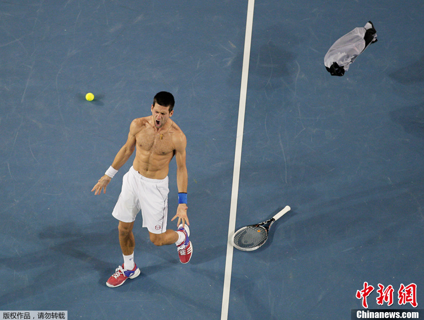 当地时间2012年1月30日,澳大利亚墨尔本,来自塞尔维亚的网球运动员德约科维奇庆祝赢得澳大利亚网球公开赛冠军。
