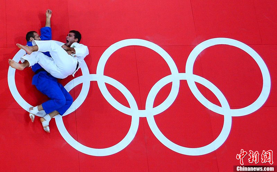当地时间2012年7月31日,英国伦敦,来自巴西的莱安德罗(白色)与来自摩洛哥的Safouane Attaf在伦敦奥运会男子81公斤级柔道比赛中。图片来源:东方IC 版权作品 请勿转载