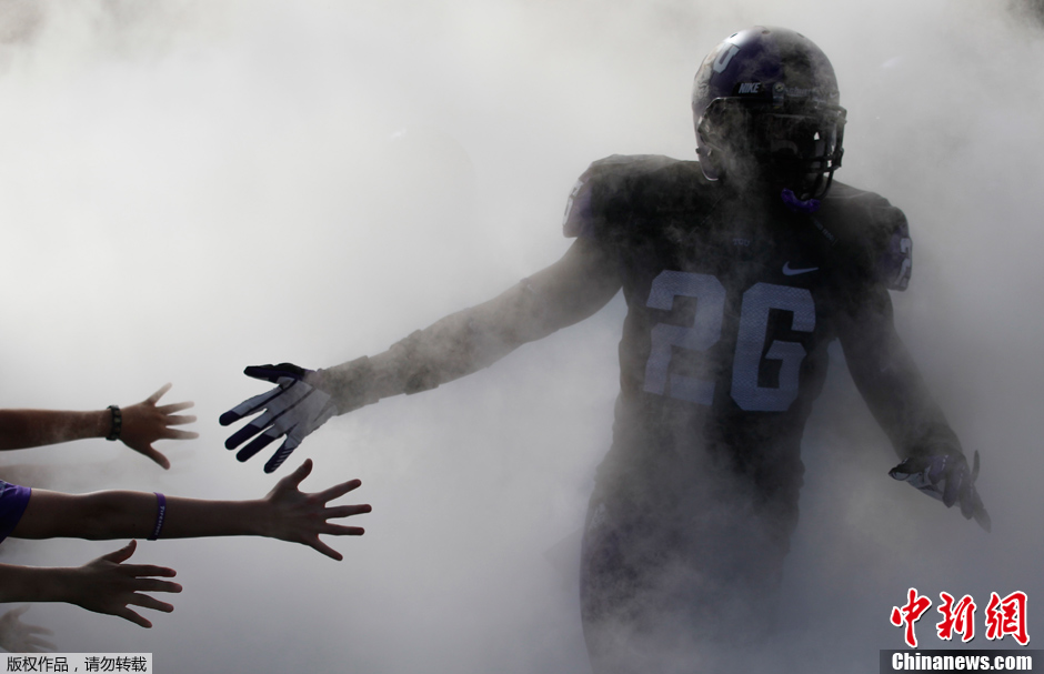 当地时间2012年9月22日,美国得克萨斯州沃思堡,美式橄榄球运动员大卫•詹金斯入场前得到球迷的击掌鼓励。