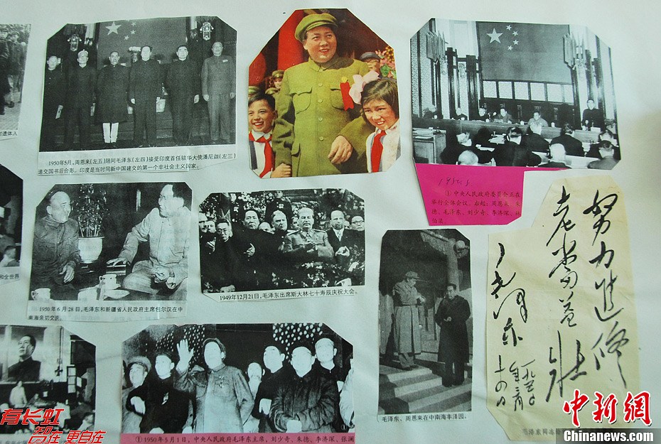 河北宽城满族自治县85岁的离休老党员翁一民,1994年开始收藏从报纸杂志上剪辑毛泽东在不同时期的老照片,目前已收藏500多张。翁一民称,这些照片将在毛泽东119周年诞辰时展览,让更多的年轻人了解中共党史,了解老一辈无产阶级革命家的丰功伟绩。图为翁一民收藏的建国初期毛泽东照片。朱建军 摄