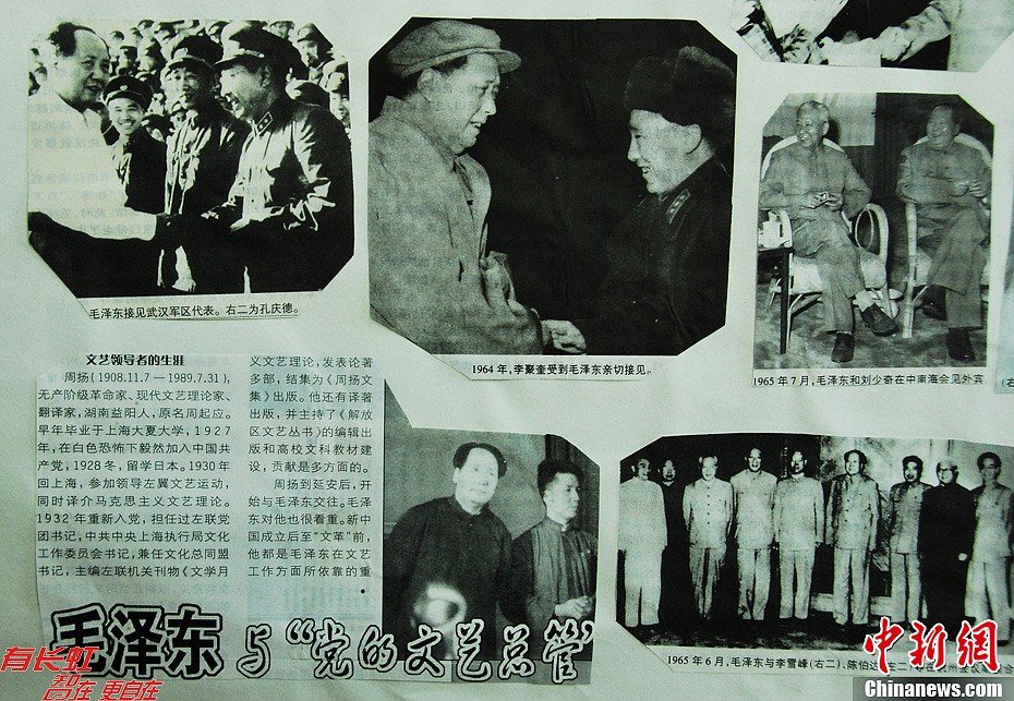 河北宽城满族自治县85岁的离休老党员翁一民,1994年开始收藏从报纸杂志上剪辑毛泽东在不同时期的老照片,目前已收藏500多张。翁一民称,这些照片将在毛泽东119周年诞辰时展览,让更多的年轻人了解中共党史,了解老一辈无产阶级革命家的丰功伟绩。图为翁一民收藏的六十年代毛泽东照片。朱建军 摄
