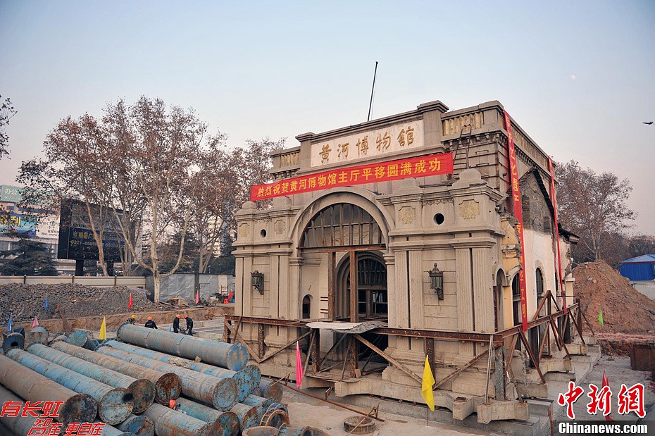 位于河南省郑州市紫荆山公园西端的黄河博物馆,由于受郑州市地铁线路的影响,从2012年5月18日起进行主楼平移。在历经7个多月4个阶段的平移后,于12月24日平移到位正式“入住”新址。此次平移线路总长度为101.7米,预计明年将全部复建完成。黄河博物馆是世界上最早成立的江河博物馆之一,也是我国唯一一座以黄河为主题内容的自然科技类博物馆。图为黄河博物馆主楼平移到位,正式“入住”新址。胡影 摄