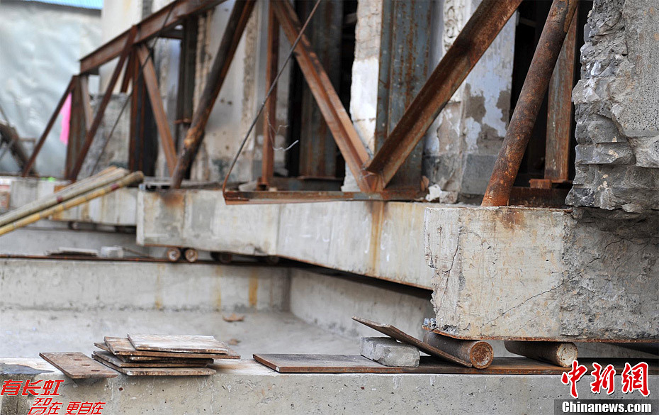位于河南省郑州市紫荆山公园西端的黄河博物馆,由于受郑州市地铁线路的影响,从2012年5月18日起进行主楼平移。在历经7个多月4个阶段的平移后,于12月24日平移到位正式“入住”新址。此次平移线路总长度为101.7米,预计明年将全部复建完成。黄河博物馆是世界上最早成立的江河博物馆之一,也是我国唯一一座以黄河为主题内容的自然科技类博物馆。图为黄河博物馆主楼靠着这样的滚筒“走”了101.7米。胡影 摄