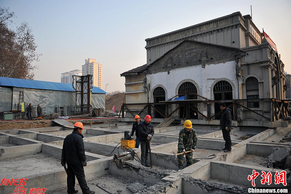位于河南省郑州市紫荆山公园西端的黄河博物馆,由于受郑州市地铁线路的影响,从2012年5月18日起进行主楼平移。在历经7个多月4个阶段的平移后,于12月24日平移到位正式“入住”新址。此次平移线路总长度为101.7米,预计明年将全部复建完成。黄河博物馆是世界上最早成立的江河博物馆之一,也是我国唯一一座以黄河为主题内容的自然科技类博物馆。图为工人正在清理建筑现场。胡影 摄