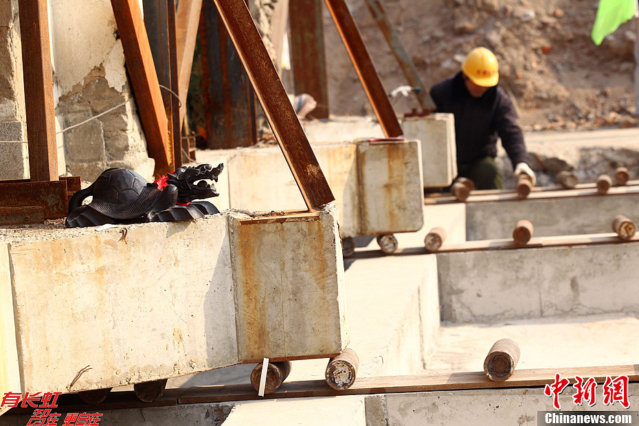 12月24日,河南郑州,黄河博物馆平移工作现场负责人肖胜利宣布黄河博物馆历经7月后平移到位。作为世界上最早成立的江河博物馆之一,中国唯一一座以黄河为专题内容的自然科技类博物馆黄河博物馆,由于受郑州市地铁线路的影响,从5月18日起进行主楼平移,整个平移分四个阶段,首先第一阶段整体向东平移33.2米,第二阶段再向南平移15.0米,第三阶段继续向东平移35.8米,最后第四阶段向南平移17.7米至新址,平移线路总长度为101.7米。黄河博物馆占地7000平方米,现有建筑约2900平方米,其中陈列面积1200平方米。图为施工人员在现场做最后移动阶段的滑轮安放。中新社发 王中举 摄