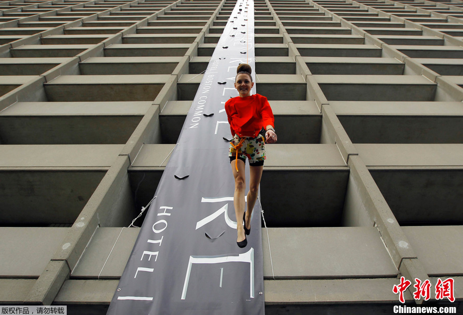 当地时间2012年4月18日,美国麻省波士顿,在当地上演的垂直时装秀上,来自波士顿岩石健身房的攀岩者们正在展示有麻省艺术与设计学院高年级学生的时装设计作品。他们表演的场地位于里维尔酒店的建筑外壁。