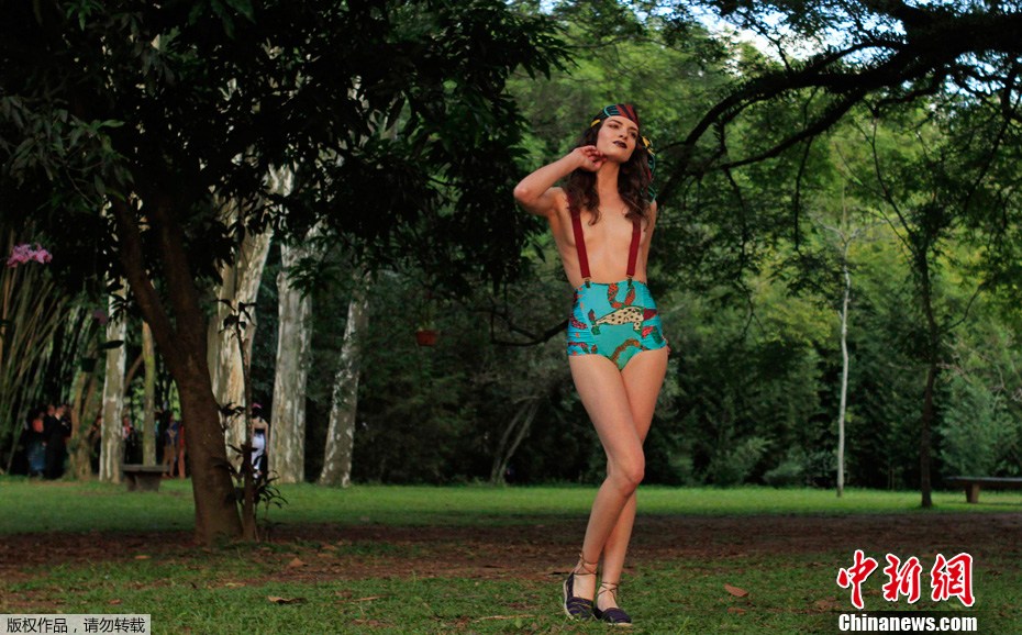2012年6月14日,2012/2013巴西圣保罗夏季时装周继续上演,模特们在室外草坪上进行时装展示。
