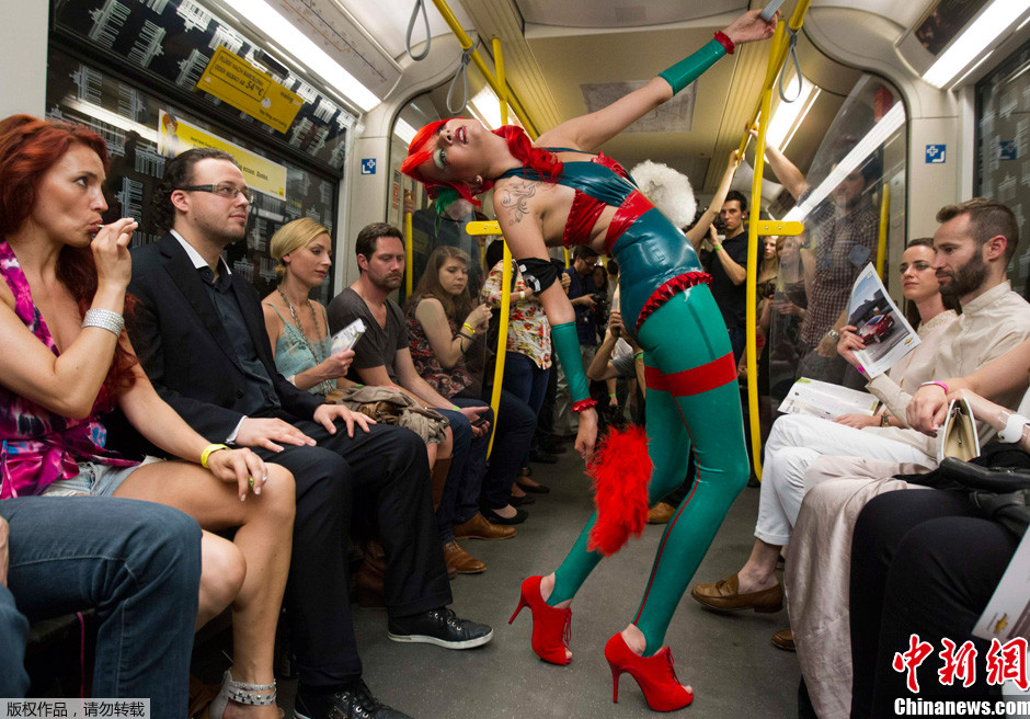当地时间2012年7月4日,德国柏林,模特在地铁走起热辣猫步。作为德国时装周的一部分,模特到地铁中展示17名设计师的作品。