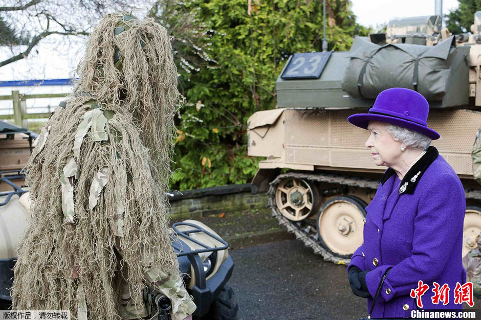 当地时间2012年11月26日,英国女王伊丽莎白二世在访问温莎的康伯米尔营区时与一名英国皇家骑兵团的狙击手见面。