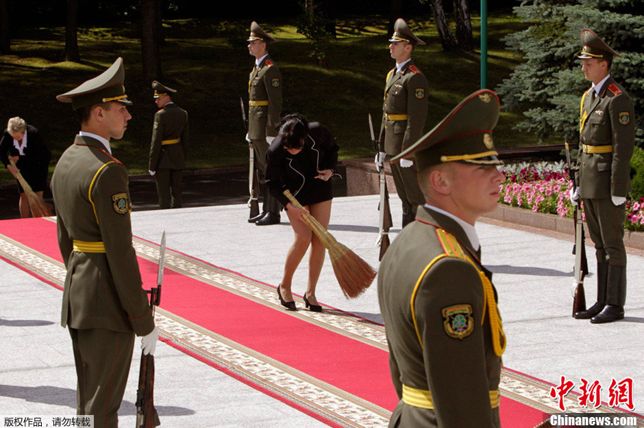 当地时间2012年7月18日,白俄罗斯明斯克,俄罗斯总理梅德韦杰夫即将到访,并与白俄罗斯总统卢卡申科会谈。卫兵列队欢迎,同时,工人们在清扫地毯。