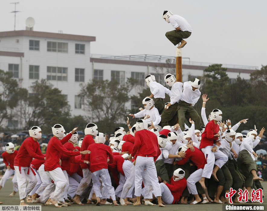 当地时间2012年11月11日,日本横须贺,日本军事国防学院的学员集体参加传统“点棒”游戏。据悉,这个游戏的目的在于锻炼学员的协同作战能力和培养他们的团队精神。