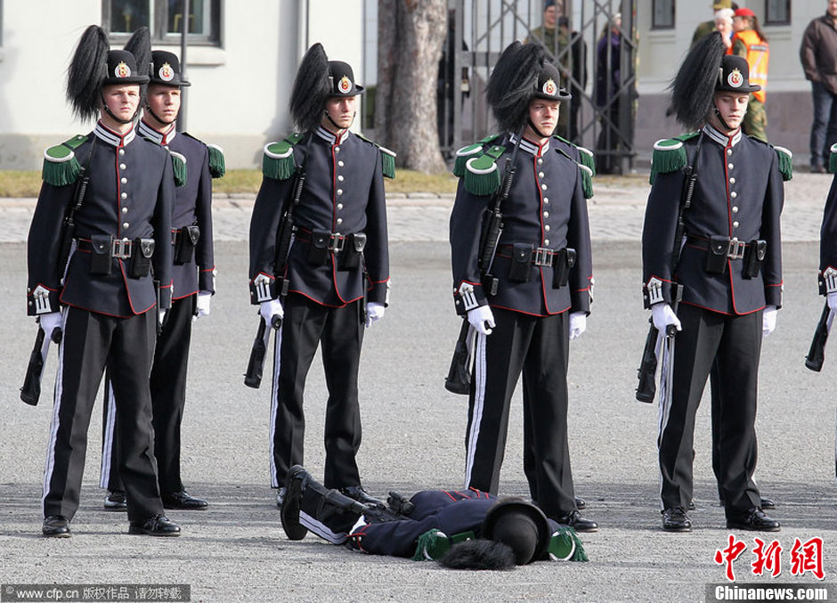 当地时间2012年3月20日,挪威奥斯陆,英国查尔斯王子访问挪威。一位士兵在欢迎仪式的列队中晕倒。图片来源:CFP视觉中国