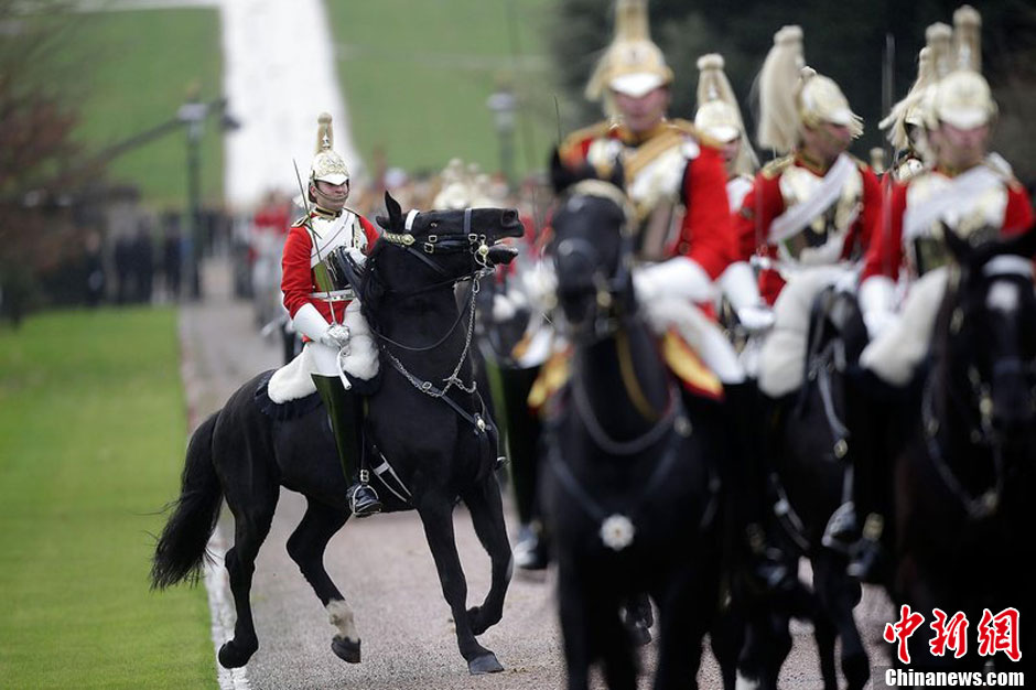 当地时间2012年11月27日,英国温莎,科威特埃米尔萨巴赫•艾哈迈德•贾比尔•萨巴赫出访英国,英女王伊莉莎白二世为其举行欢迎仪式。在欢迎仪式上,皇家骑兵仪仗队中有一头马受惊,失去控制,偏离队伍。图片来源:CFP视觉中国