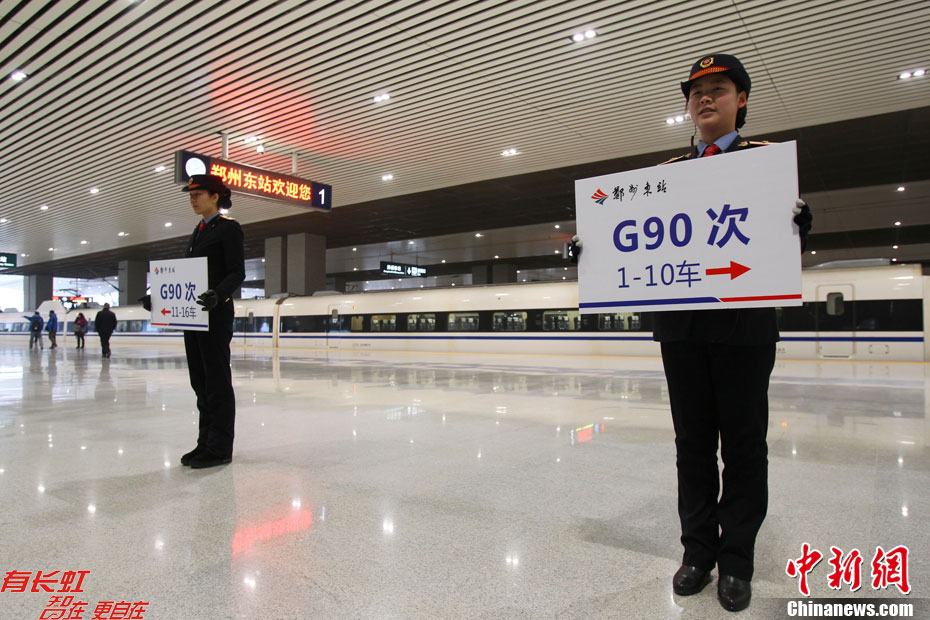 12月26日,河南郑州,服务员引导乘客乘坐京广高铁。当日,世界上运营里程最长的高速铁路京广高铁正式开通运营,全程2298公里,全线设计时速350公里。中新社发 王中举 摄
