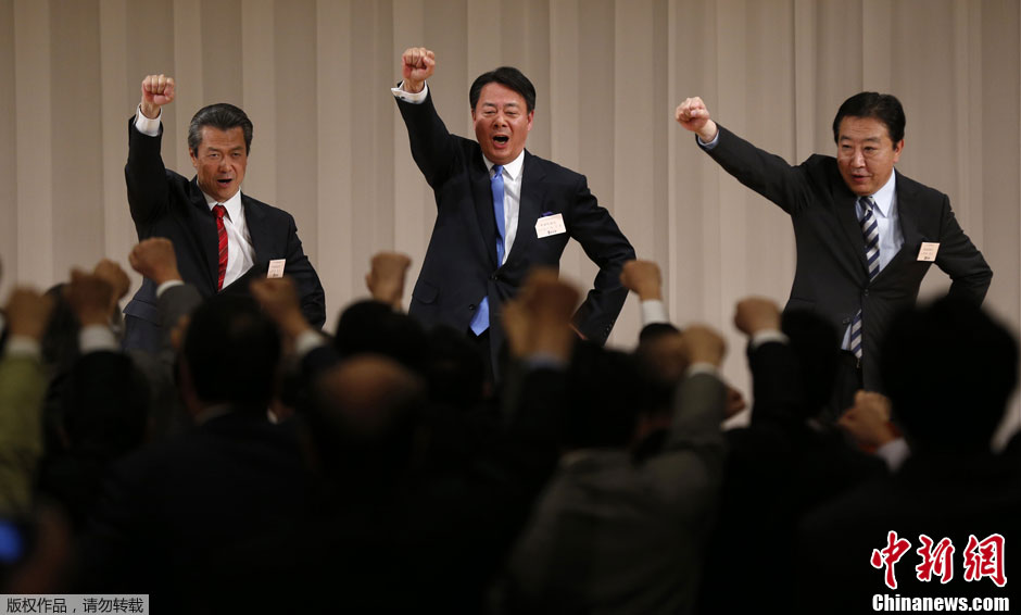 当地时间12月25日,日本东京举行新党首选举,由民主党所属全体众议院议员和参议员议员投票选举了前经济产业相,现年63岁的海江田万里(中)担任民主党新党首。据悉,野田领导的民主党在12月16日的大选中遭遇惨败,担任党首的野田随后宣布引咎辞职。