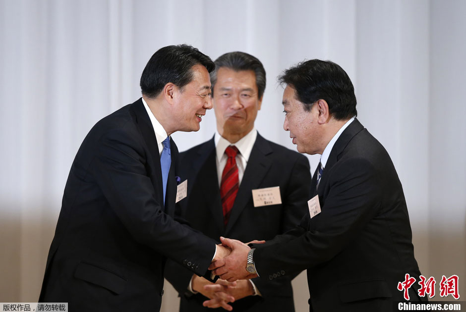 当地时间12月25日,日本东京举行新党首选举,由民主党所属全体众议院议员和参议员议员投票选举了前经济产业相,现年63岁的海江田万里(左)担任民主党新党首。据悉,野田领导的民主党在12月16日的大选中遭遇惨败,担任党首的野田随后宣布引咎辞职。
