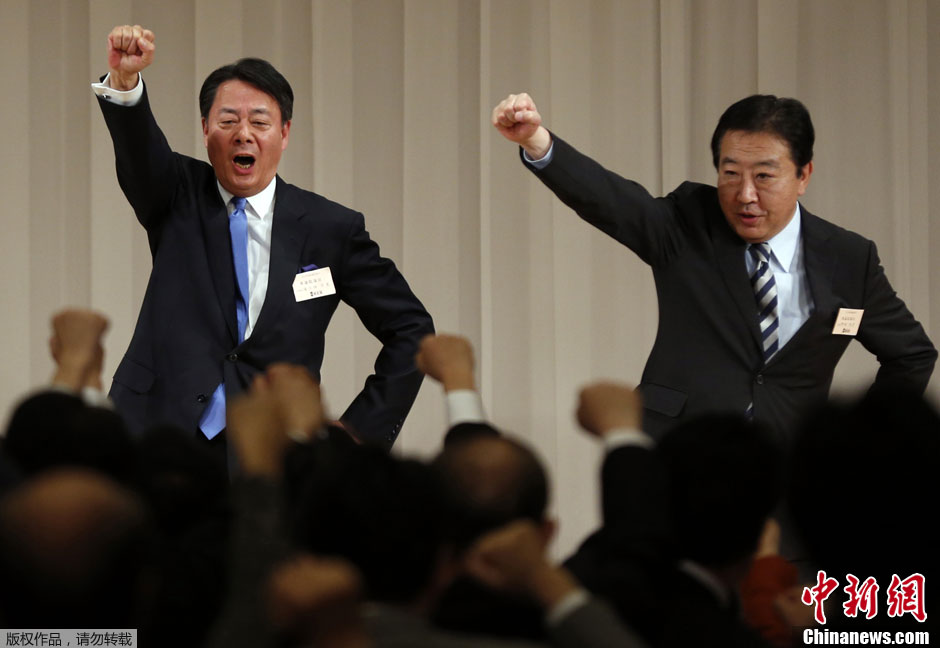 当地时间12月25日,日本东京举行新党首选举,由民主党所属全体众议院议员和参议员议员投票选举了前经济产业相,现年63岁的海江田万里(左)担任民主党新党首。据悉,野田领导的民主党在12月16日的大选中遭遇惨败,担任党首的野田随后宣布引咎辞职。
