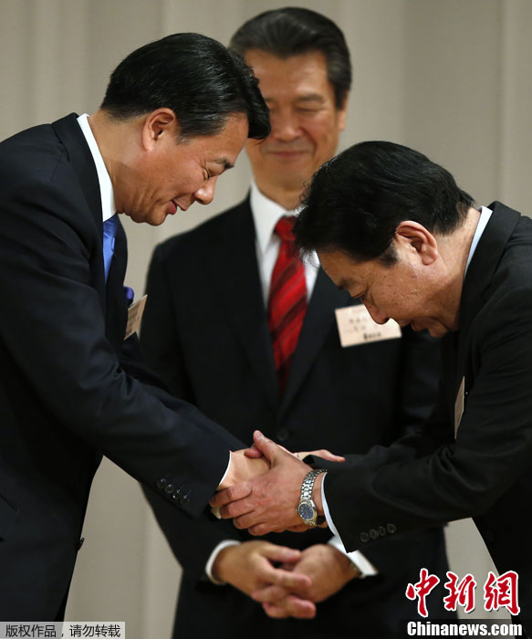 当地时间12月25日,日本东京举行新党首选举,由民主党所属全体众议院议员和参议员议员投票选举了前经济产业相,现年63岁的海江田万里(左)担任民主党新党首。据悉,野田领导的民主党在12月16日的大选中遭遇惨败,担任党首的野田随后宣布引咎辞职。