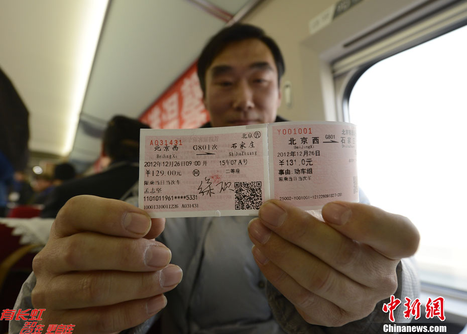 12月26日,京广高速铁路正式全线贯通运营,图为乘客孟志坚展示自己在列车上通过补票途径获得的001号车票(右),以及G801次列车的列车长给他的签名。京广高铁全长2298公里,北起北京,经石家庄、郑州、武汉、长沙,南至广州,是世界上最长的高速铁路。京广高铁全线设计速度350公里/小时,初期运营速度300公里/小时,最快车次约8小时即可抵达终点。中新社发 侯宇 摄