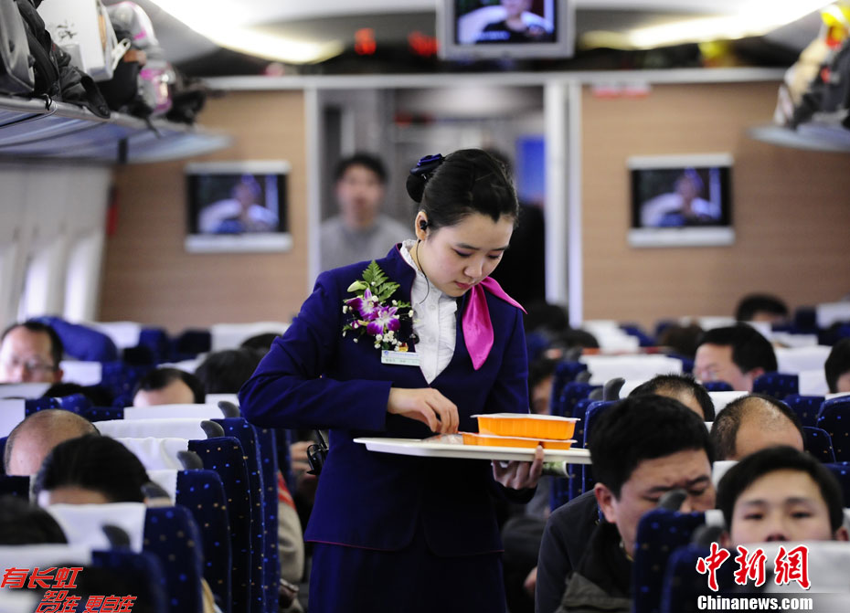 12月26日,京广高铁正式全线贯通运营,图为G801次列车的乘务员为二等座席车厢的乘客送餐。中新社发 侯宇 摄