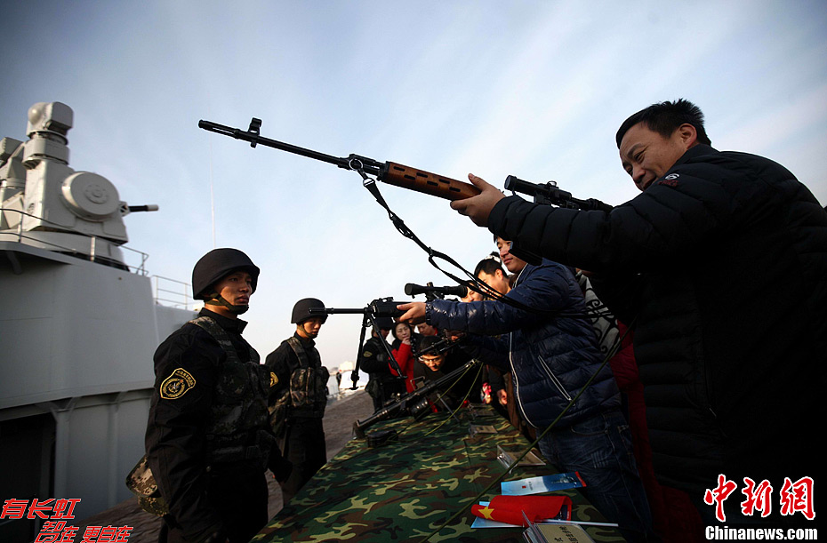 12月26日,中国海军导弹驱逐舰“青岛舰”在青岛某军港对外开放,青岛市民登上军舰,与舰载直升机、特战装备零距离接触。“青岛舰”隶属于海军北海舰队,被誉为“中华第一舰”,曾多次代表中国海军承担出国访问任务,执行过亚丁湾海域护航等重大任务。中新社发 徐崇德 摄