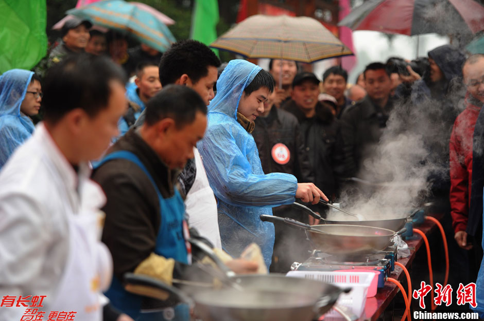 12月26日,重庆市江北区·五宝“年猪文化节”在五宝镇文化广场隆重拉开序幕。众多当地居民积极参与文艺表演、屠夫解猪比赛、年猪厨艺大赛、猜重称猪比赛等地方特色文化活动,享受节日的喜庆。图为年猪厨艺大赛环节。陈超 摄