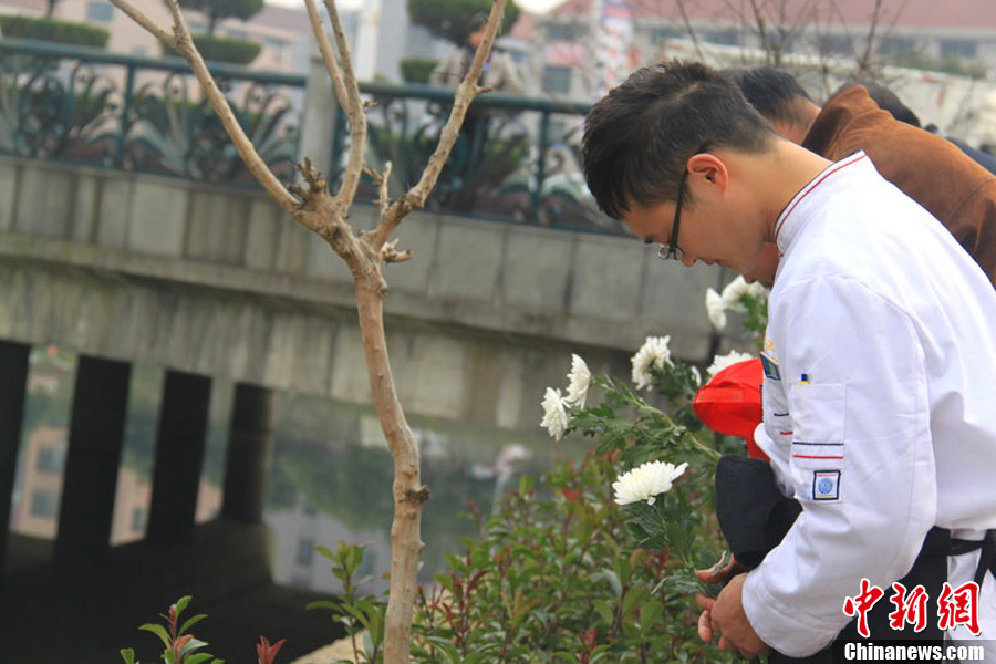 2012年12月25日,浙江金华,市民在溪边祭拜杜世华。21日,在永康市五金城经营钢丝网的老板杜光华请员工吃饭过冬至,一名员工因酒喝多了在溪边方便失足落水,身家过亿的杜老板跳河救人,不幸遇难。图片来源:东方IC 版权作品 请勿转载