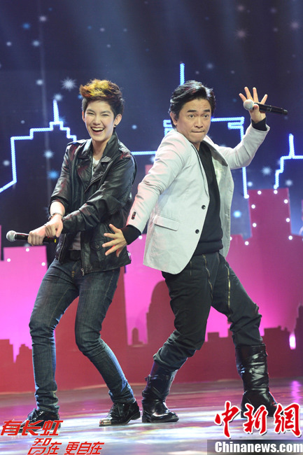12月26日晚,综艺节目《我是传奇2》在北京录制,主持人郭德纲和吴宗宪(右)插科打诨,爆笑不断。26日的录制现场更吸引了泰国人气偶像李缇娜(左),与吴宗宪上演无限次自拍表情秀。中新社发 李学仕 摄