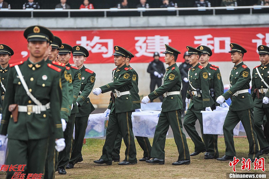 12月28日,广西壮族自治区公安厅以南宁为主会场,在14个市同时开展公开焚烧毒品活动,销毁由广西各级执法部门收缴的海洛因、麻古等各类毒品约2吨,以提高公众禁毒意识。据统计,广西公安机关三年来共破获毒品违法犯罪案件30220起,抓获毒品违法犯罪嫌疑人35405人,缴获各类毒品16.3吨。图为武警战士将待销毁毒品押送焚烧。洪坚鹏 摄