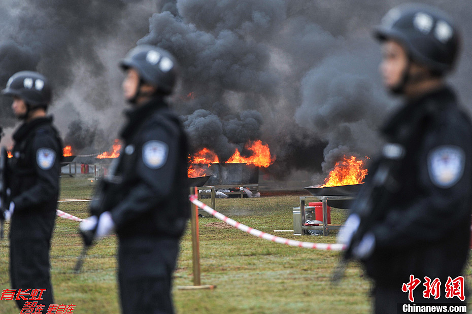 12月28日,广西壮族自治区公安厅以南宁为主会场,在14个市同时开展公开焚烧毒品活动,销毁由广西各级执法部门收缴的海洛因、麻古等各类毒品约2吨,以提高公众禁毒意识。据统计,广西公安机关三年来共破获毒品违法犯罪案件30220起,抓获毒品违法犯罪嫌疑人35405人,缴获各类毒品16.3吨。图为销毁毒品现场进行警戒的特警。洪坚鹏 摄