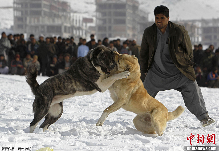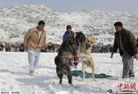 当地时间12月28日,阿富汗民众在首都喀布尔周边雪地举行了传统的斗狗比赛。