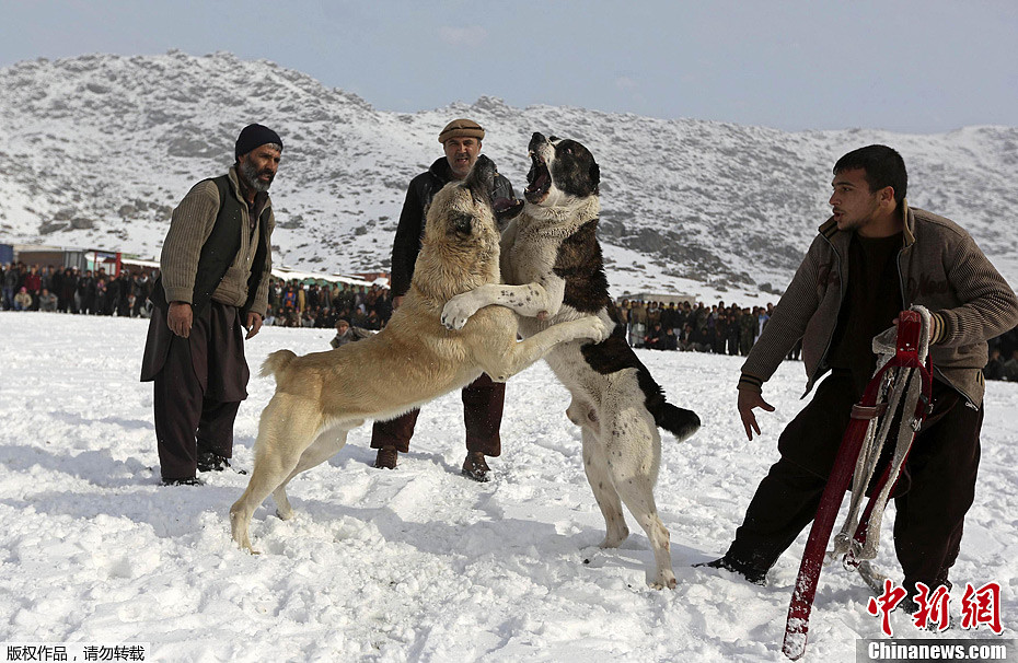 当地时间12月28日,阿富汗民众在首都喀布尔周边雪地举行了传统的斗狗比赛。