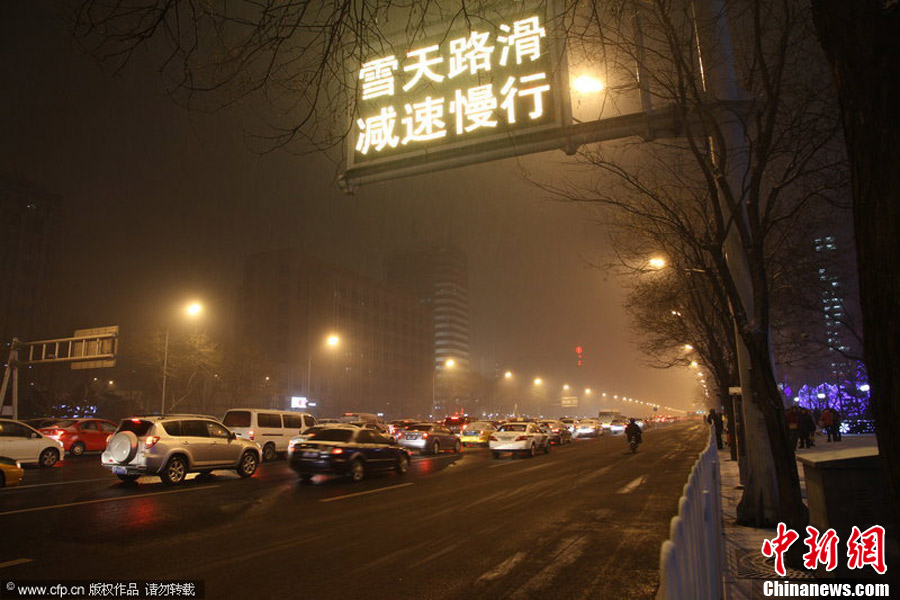 12月28日,北京又降小雪。北京市气象台28日17时发布道路结冰黄色预警信息。虽然是小雪,但昨天是周五,又恰逢元旦节前出行高峰,降雪让交通出行备受考验。王敬华 摄 图片来源:CFP视觉中国