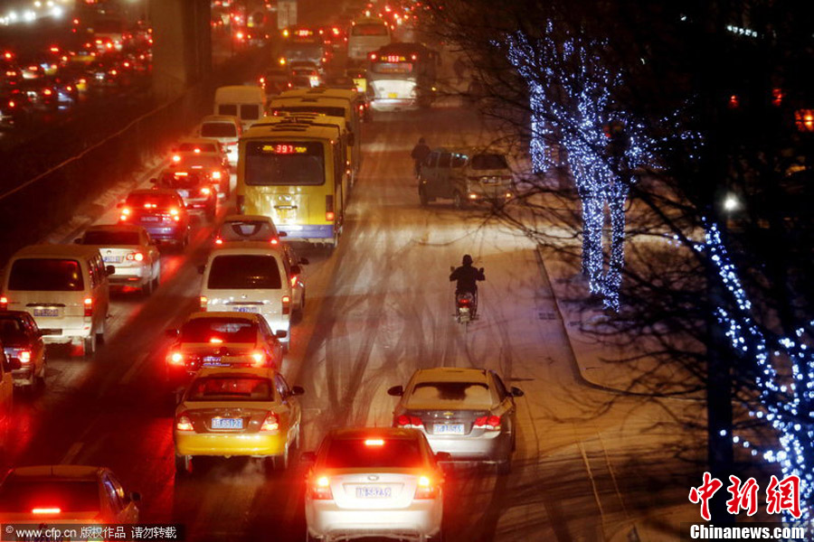 12月28日晚5时许,小雪光临周五晚高峰 京城“爆堵”。图片来源:CFP视觉中国