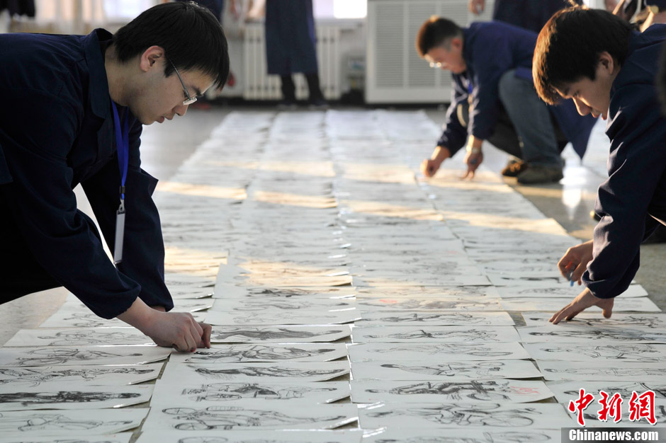 12月29日,2013年高考山西美术专业考试阅卷工作在某高校展开。在评卷现场,数以万计的素描作品一排排铺开,考务工作人员依次对每张作品进行编号和打分,场面蔚为壮观。韦亮 摄
