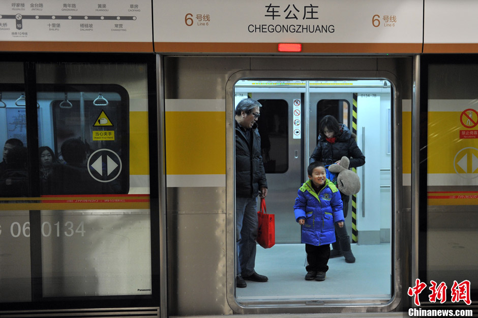 12月30日起,北京地铁6号线一期、8号线二期南段、9号线北段和10号线二期开通试运营。总里程69.8公里的4条新线开通后,全市轨道交通总里程将达到442公里,车站261座,换乘站37座。在地铁开通日的安排上,与往年不同的是,不搞开通仪式、无领导讲话,乘客从今早各条地铁新线的首班车起就能第一时间进站乘车。图为小朋友体验6号线地铁新线。中新网记者 金硕 摄