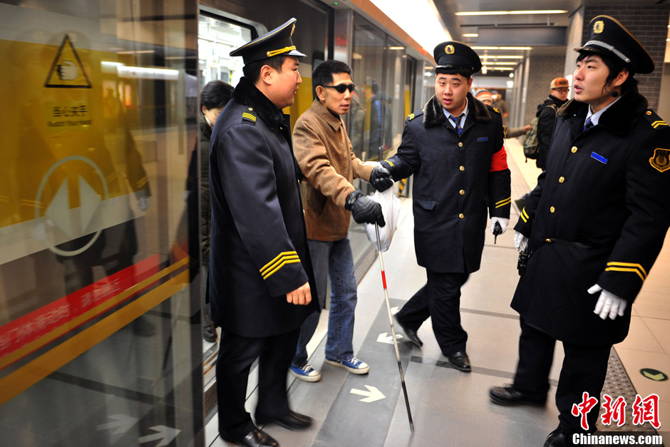 12月30日起,北京地铁6号线一期、8号线二期南段、9号线北段和10号线二期开通试运营。当日,一位盲人乘坐地铁新线乘车转站,每到一站都有工作人员提前在站台等候,为残疾人朋友提供出行便利。中新网记者 金硕 摄