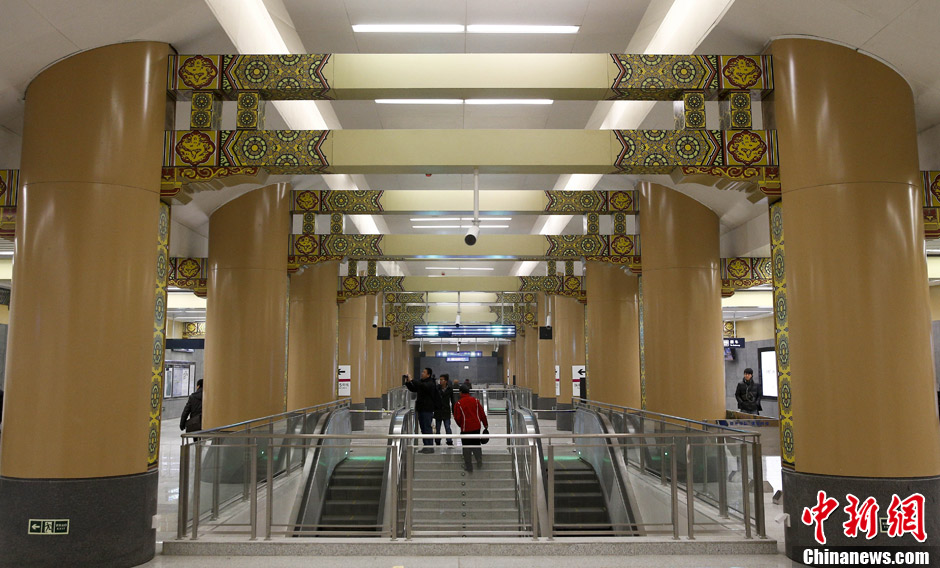 12月30日,乘客在北京地铁6号线东四站内行走,这里将东四牌楼的“型”融合在了建筑空间内。中新社发 张浩 摄