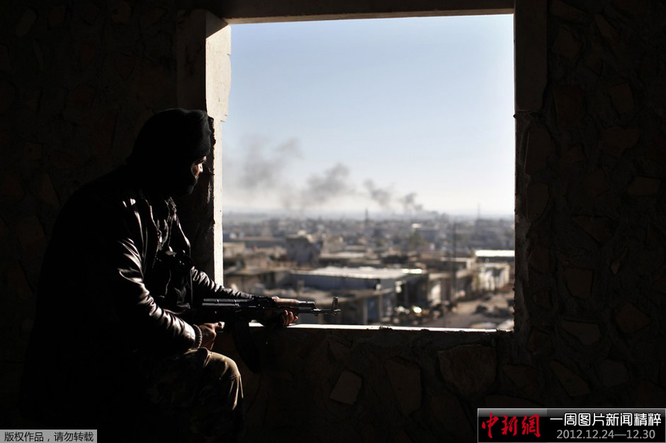 12月26日,叙利亚阿勒颇,一名叙利亚自由军(Free Syria Army)士兵守在自己的岗位上,看着己方士兵和忠于总统阿萨德(Bashar al-Assad)的部队战斗。
